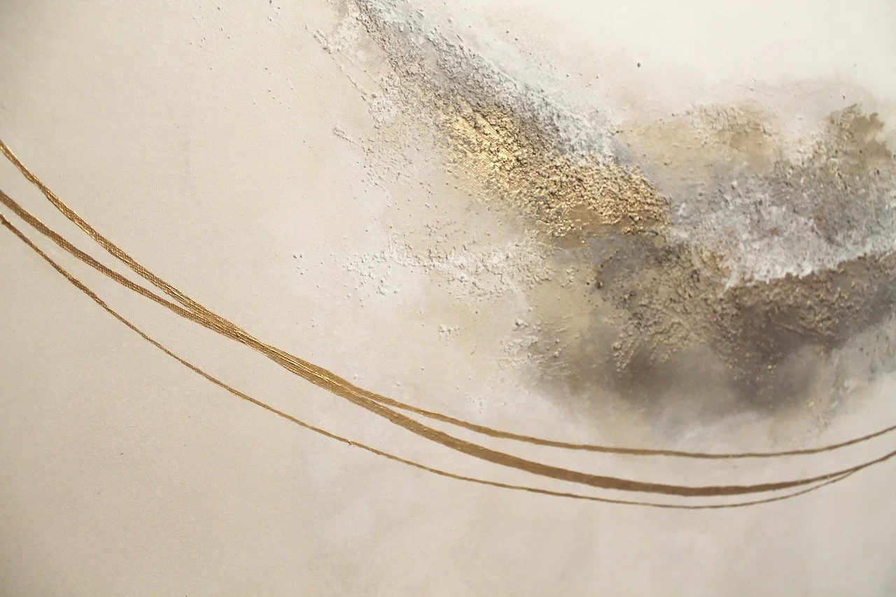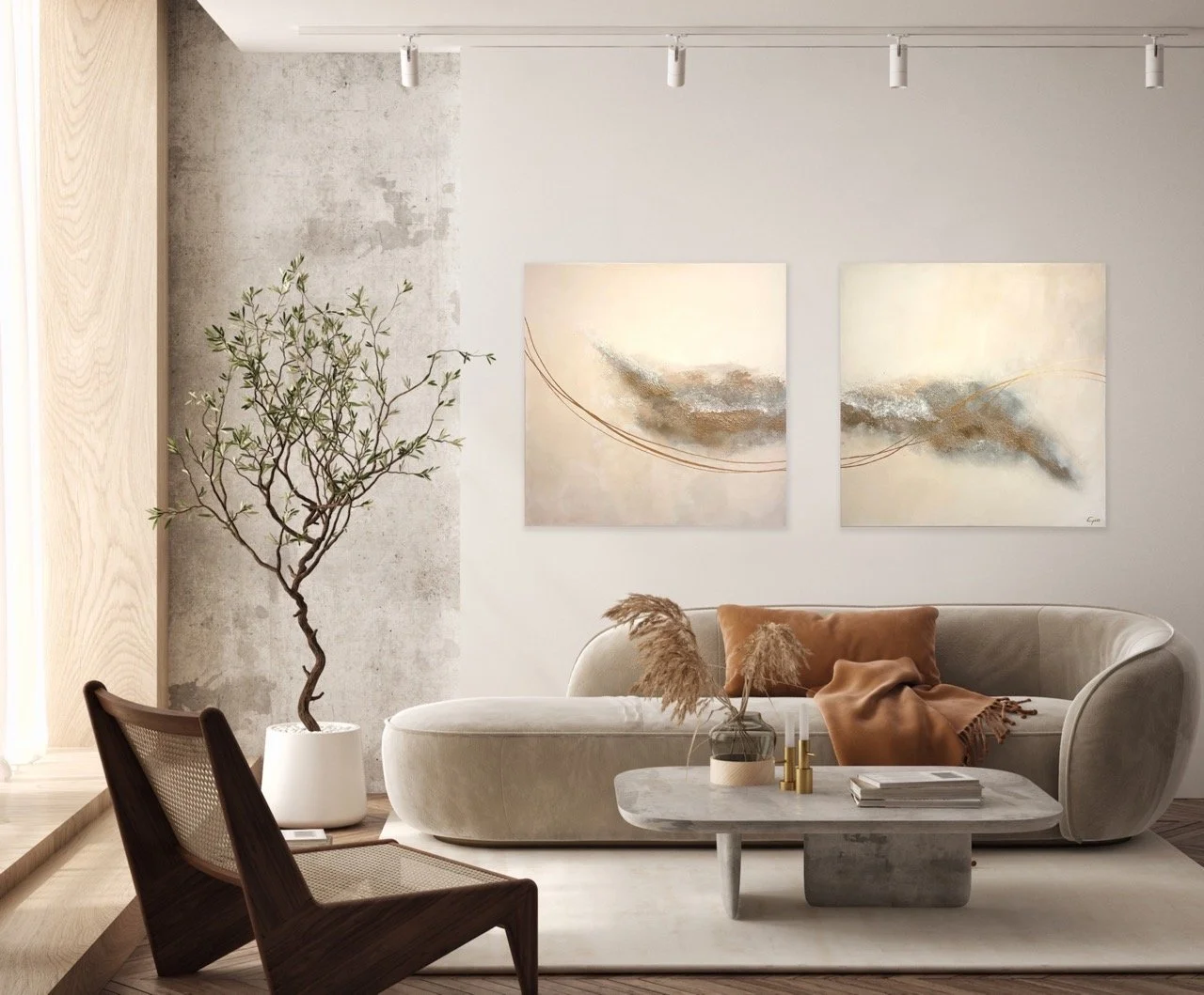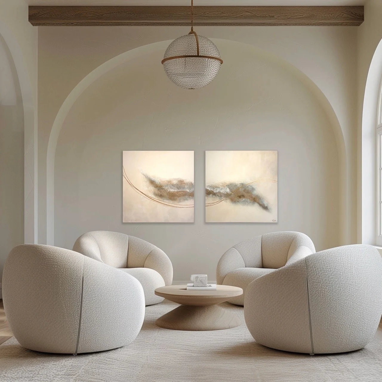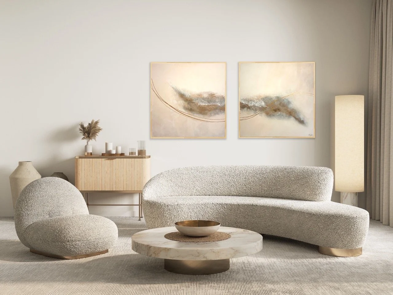 Zentrales Element dieser Kollektion sind die klaren Linien, die sich in verschiedenen Formen auf jedem Bild harmonisch einfügen. Wellen, Kreise und Rechtecke treffen auf weiche Texturen und erzeugen so eine einzigartige visuelle Spannung. Diese Mischung aus präzisen Formen und weichen Texturen lädt den Betrachter ein, die kunstvolle Balance zwischen Ordnung und Freiheit zu erleben.